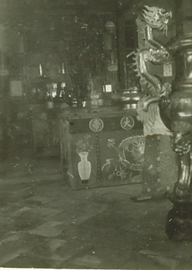 Bij de ingang moet ik eerst mijn schoenen uittrekken en baret afzetten. Binnen in de tempel is het vrij donker, overal staan potjes met brandende kaarsjes; tevens ontwaar ik ergens in het donker een of ander afgodsbeeld met grote bolle ogen.