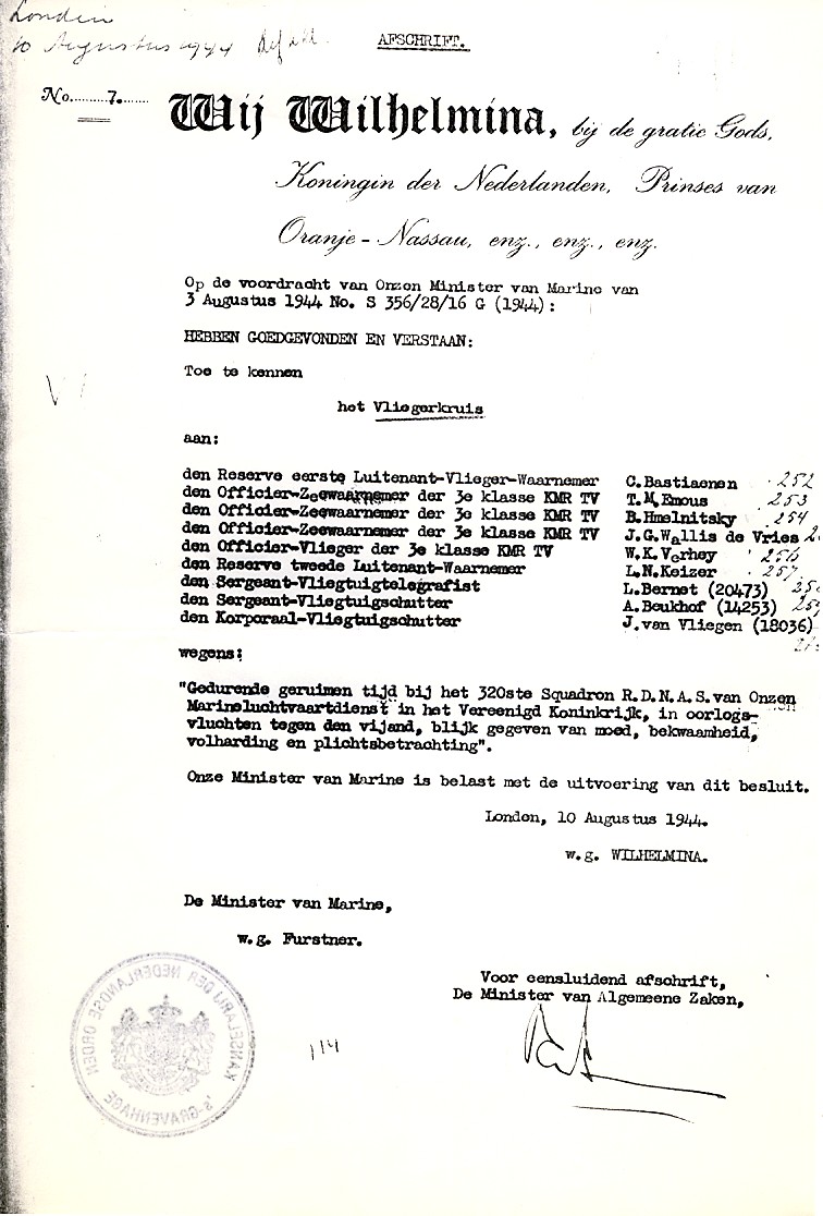 Gedurende geruimen tijd bij het 320e Squadron R.D.N.A.S. van Onzen Marine Luchtvaartdienst in het Vereenigd Koninkrijk, in oorlogsvluchten tegen den vijandblijk gegeven van moed, bekwaamheid, volharding en plichtsbetrachting.